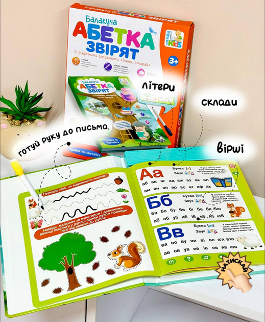 Книга складається з 22 цікавих інтерактивних сторінок із письмовими завданнями на звороті. У наборі є спеціальний маркер для виконання веселих ребусів і завдань, легко можна стерти спеціальною губкою.